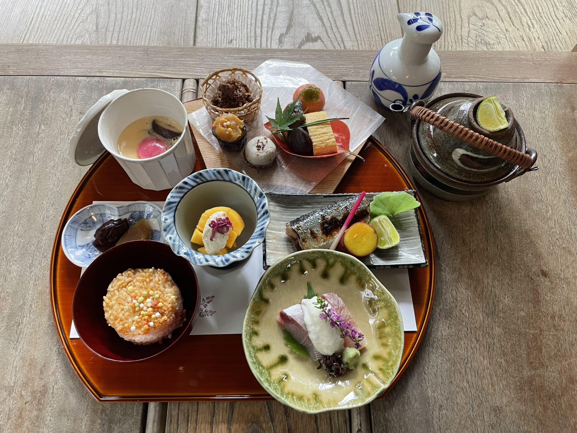 こげ茶漬、柿白和え、茶碗蒸し、お造りとろろかけ、さんま塩焼き、さつま芋レモン煮、牛肉しぐれ煮、茄子田楽、出汁巻き玉子、栗、鮎甘露煮、季節のお菓子